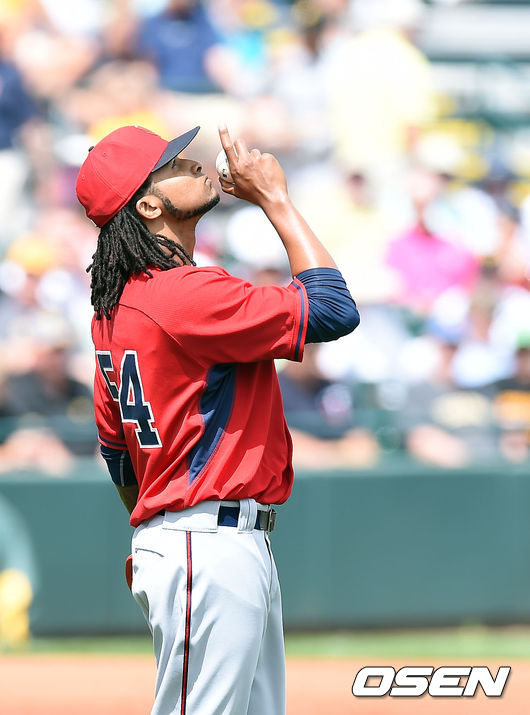 미네소타 어빈 산타나가 등판에 앞서 세레머니를 하고 있다./ youngrae@osen.co.kr