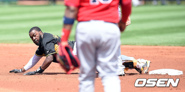 1회말 무사 피츠버그 조시 해리슨이 안타를 때린 뒤 2루까지 진루하려다 아웃당하고 있다./ youngrae@osen.co.kr