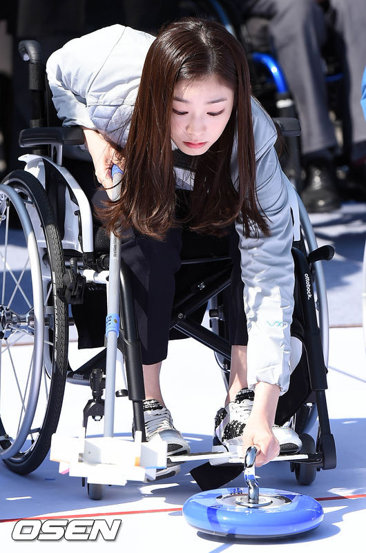 행사에 참석한 김연아가 휠체어컬링 종목을 체험하고 있다.