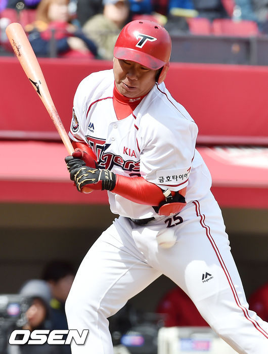 14일 오후 광주 기아 챔피언스 필드서 ‘2015 타이어뱅크 KBO 리그’ 시범경기 KIA 타이거즈와 LG 트윈스의 경기가 열렸다. 1회말 2사 주자 1루 KIA 이범호가 타석에서 LG 선발 루카스가 뿌린 공에 맞고 있다.