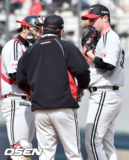 14일 오후 광주 기아 챔피언스 필드서 ‘2015 타이어뱅크 KBO 리그’ 시범경기 KIA 타이거즈와 LG 트윈스의 경기가 열렸다. 1회말 2사 주자 1루 KIA 이범호가 타석, LG 선발 루카스가 이범호 몸에 볼 맞춘 후 강상수 투수 코치와 얘기를 나누고 있다.