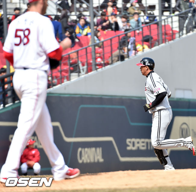 14일 오후 광주 기아 챔피언스 필드서 ‘2015 타이어뱅크 KBO 리그’ 시범경기 KIA 타이거즈와 LG 트윈스의 경기가 열렸다. 2회초 무사 주자 1루 LG 이병규가 중월 동점 투런 홈런을 날린 후 그라운드를 돌고 있다.