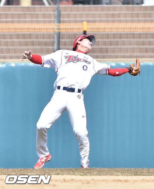 14일 오후 광주 기아 챔피언스 필드서 ‘2015 타이어뱅크 KBO 리그’ 시범경기 KIA 타이거즈와 LG 트윈스의 경기가 열렸다. 2회초 1사 주자 1루 LG 유강남의 타구를 KIA 유격수 최병연이 잡아내고 있다.