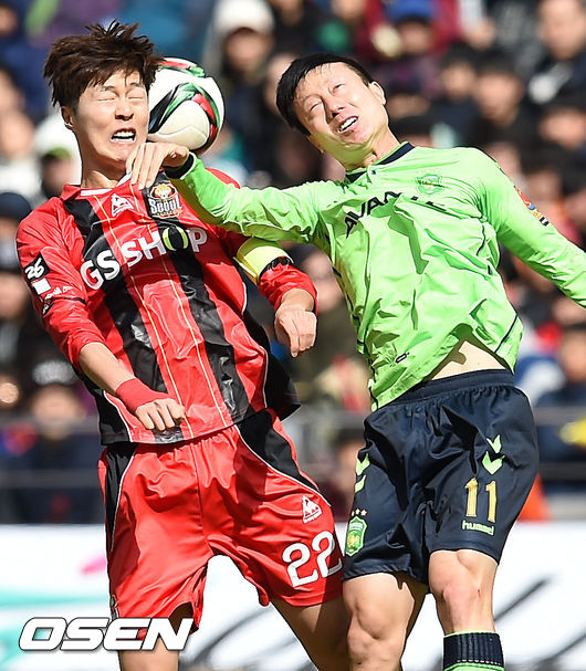 14일 오후 서울 상암동 서울월드컵경기장에서 열린 2015 K리그 클래식 'FC 서울과 전북 현대'의 경기, 전반전 서울 고명진과 현대 이승현이 공중볼을 다투고 있다.