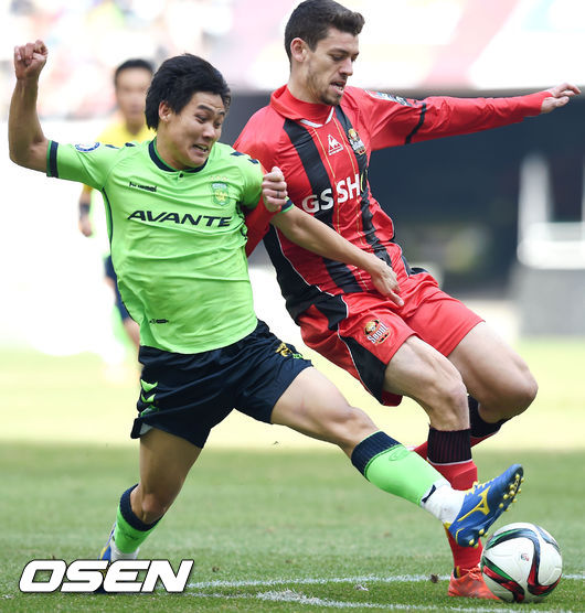 14일 오후 서울 상암동 서울월드컵경기장에서 열린 2015 K리그 클래식 'FC 서울과 전북 현대'의 경기 후반전,현대 최철순과 서울 오스마르가 볼다툼을 하고 있다.