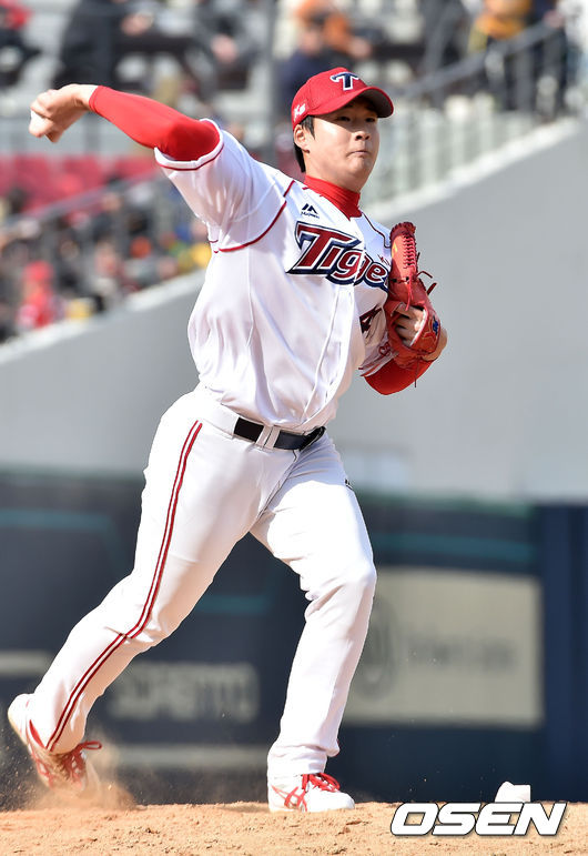 14일 오후 광주 기아 챔피언스 필드서 ‘2015 타이어뱅크 KBO 리그’ 시범경기 KIA 타이거즈와 LG 트윈스의 경기가 열렸다. 7회초 마운드에 오른 KIA 한승혁이 무사 주자 1루 LG 이병규 타석에서 1루로 견제구를 계속 던지고 있다.