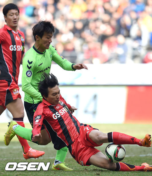 14일 오후 서울 상암동 서울월드컵경기장에서 열린 2015 K리그 클래식 'FC 서울과 전북 현대'의 경기 후반전, 서울 김치우가 현대 한교원과의 볼 싸움에서 공을 차지하며 넘어지고 있다.