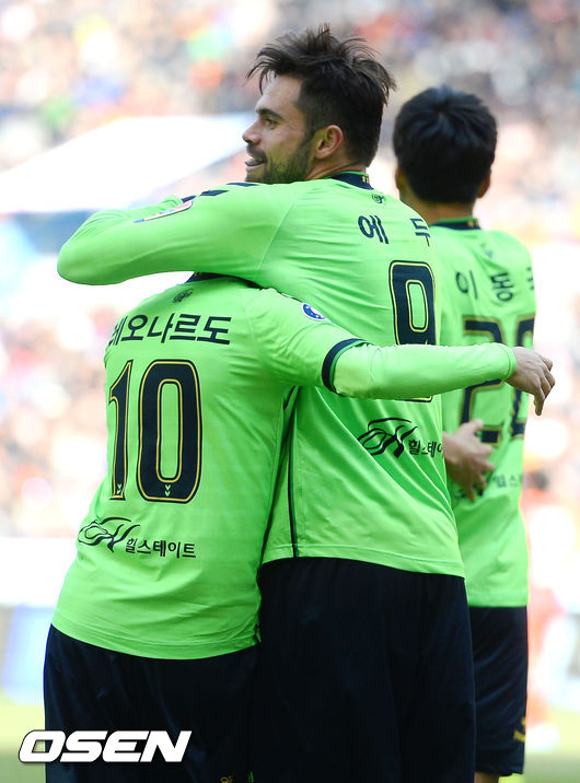 14일 오후 서울 상암동 서울월드컵경기장에서 열린 2015 K리그 클래식 'FC 서울과 전북 현대'의 경기 후반전, 선두골에 성공한 현대 에두가 동료들과 기쁨을 나누고 있다.