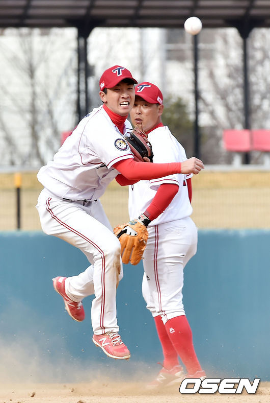 14일 오후 광주 기아 챔피언스 필드서 ‘2015 타이어뱅크 KBO 리그’ 시범경기 KIA 타이거즈와 LG 트윈스의 경기가 열렸다. 8회초 무사 주자 1,2루 LG 김용의의 2루수 병살타때 KIA 유격수 이인행이 2루에서 LG 윤진호를 포스아웃 시킨 후 몸을 날리며 1루로 송구하고 있다.