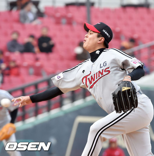 14일 오후 광주 기아 챔피언스 필드서 ‘2015 타이어뱅크 KBO 리그’ 시범경기 KIA 타이거즈와 LG 트윈스의 경기가 열렸다. 8회말 1사 KIA 이홍구 타석때 마운드에 오른 LG 김선규가 힘차게 공을 뿌리고 있다.
