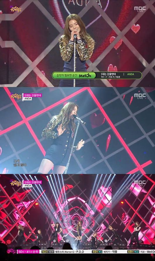 이날 골드 스팽글이 인상적인 초밀착 점프슈트를 착용, 발랄함과 은은한 섹시함이 동시에 풍기는 감각적 ‘스포티 스쿨 걸’ 패션으로 무대에 오른 안다는 보컬라인과 리드미컬 랩 파트를 자유자재로 넘나드는 안정적인 가창력으로 한층 업그레이드된 음악성을 자랑했다.