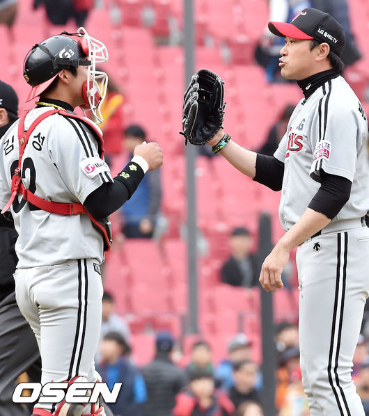 경기를 마치고 LG 김재성과 봉중근이 하이파이브를 하고 있다. / rumi@osen.co.kr