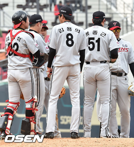 경기를 마치고 LG 선수들이 마운드 근처에 모여서 하이파이브를 하고 있다. / rumi@osen.co.kr