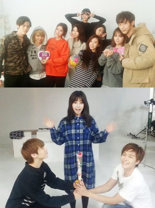 해당 사진에는 엔플라잉 멤버 차훈과 김재현이 AOA멤버들과 다정하게 서 있는 모습이 담겨 있다.