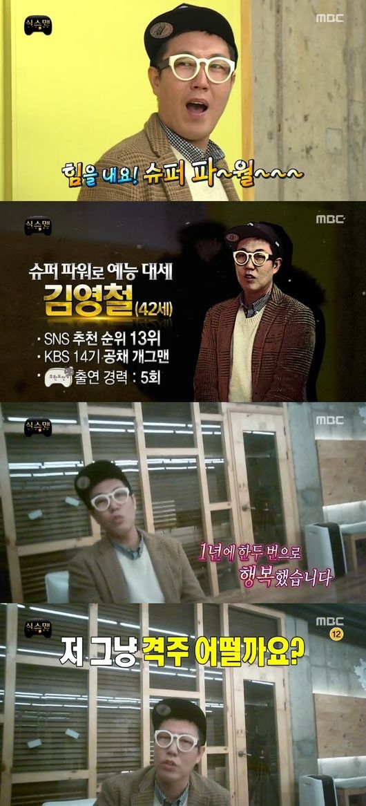 이날 김영철은 "힘을내요. 슈퍼파워"라며 재미있게 등장했고, 식스맨 후보가 됐다는 이야기에 긴장했다.