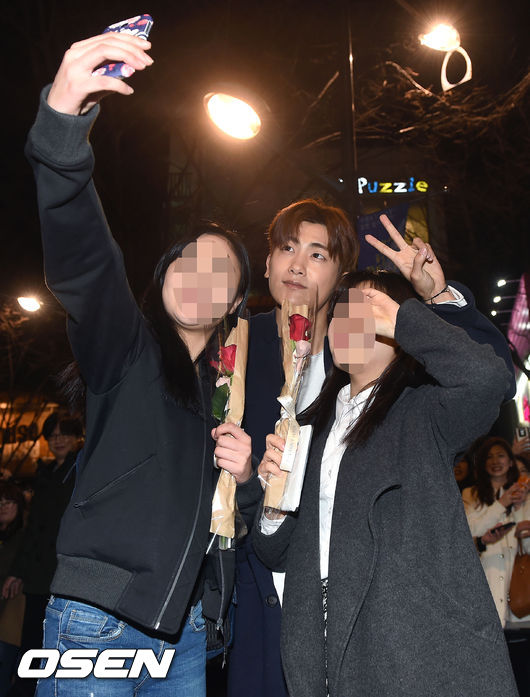 V.O.S 버스킹을 응원온 제국의아이들 멤버 박형식이 팬과 셀카촬영을 하고 있다.
