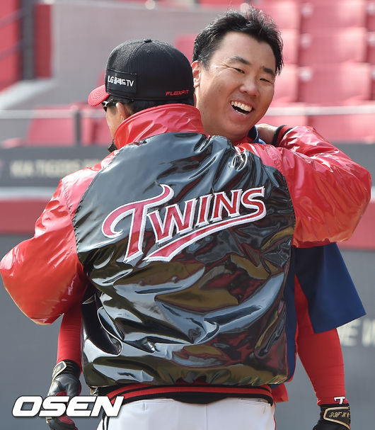 15일 오후 광주 기아 챔피언스 필드서 ‘2015 타이어뱅크 KBO 리그’ 시범경기 KIA 타이거즈와 LG 트윈스의 경기가 열릴 예정인 가운데 양팀 훈련 시간에 LG 양상문 감독이 KIA 이범호와 포옹을 하고 있다.