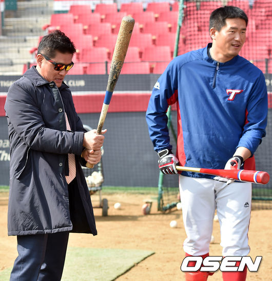 15일 오후 광주 기아 챔피언스 필드서 ‘2015 타이어뱅크 KBO 리그’ 시범경기 KIA 타이거즈와 LG 트윈스의 경기가 열릴 예정인 가운데 양팀 훈련 시간에 KIA 최희섭이 타격연습 할때 이종범 MBC 스포츠플러스 해설위원이 다가와 배트를 만지고 있다.
