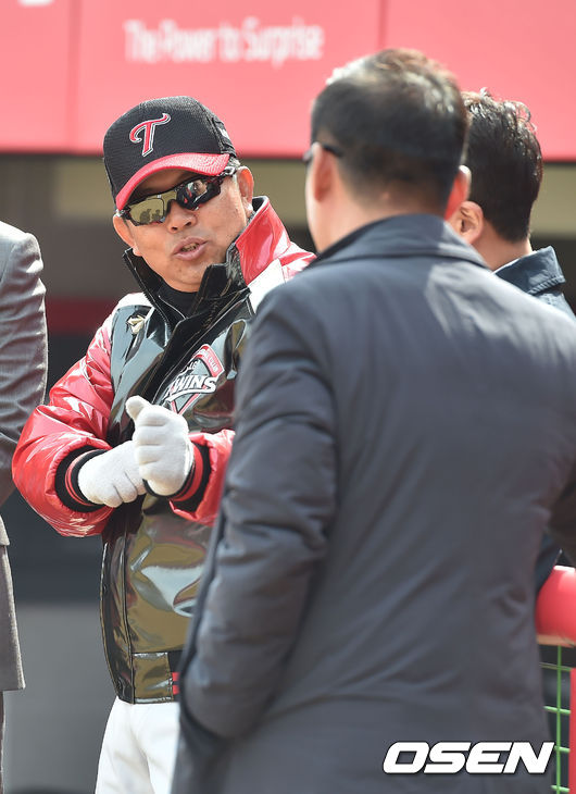 15일 오후 광주 기아 챔피언스 필드서 ‘2015 타이어뱅크 KBO 리그’ 시범경기 KIA 타이거즈와 LG 트윈스의 경기가 열릴 예정인 가운데 양팀 훈련 시간에 LG 양상문 감독이 이종범 MBC 스포츠플러스 해설위원과 타격에 대해 얘기를 나누고 있다.