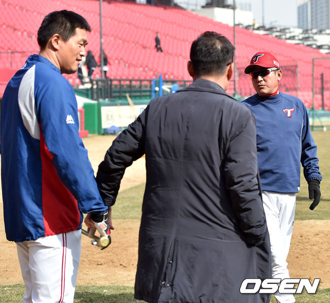 15일 오후 광주 기아 챔피언스 필드서 ‘2015 타이어뱅크 KBO 리그’ 시범경기 KIA 타이거즈와 LG 트윈스의 경기가 열릴 예정인 가운데 양팀 훈련 시간에 KIA 최희섭이 이종범 MBC 스포츠플러스 해설위원과 손을 잡고 있을때 KIA 김기태 감독이 말을 하고 있다.