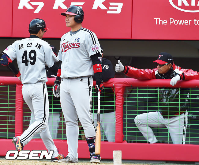 15일 오후 광주 기아 챔피언스 필드서 ‘2015 타이어뱅크 KBO 리그’ 시범경기 KIA 타이거즈와 LG 트윈스의 경기가 열렸다. 7회초 2사 주자 2,3루 LG 문선재가 좌월 스리런 홈런을 날린 후 덕아웃에서 양상문 감독이 문선재에게 엄지손가락을 올리고 있다.