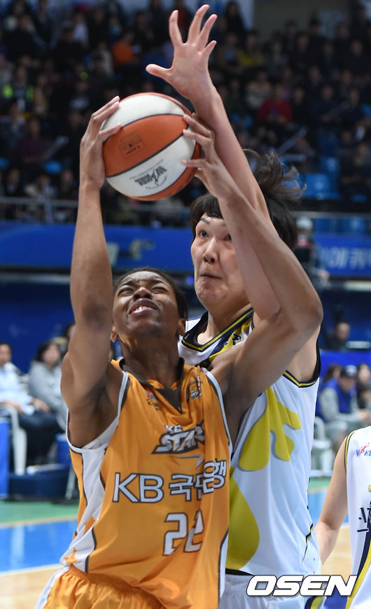 15일 오후 인천 도원체육관에서 2014-2015 KB 국민은행 여자프로농구 플레이오프 1차전 신한은행 에스버드와 KB스타즈의 경기가 열렸다.