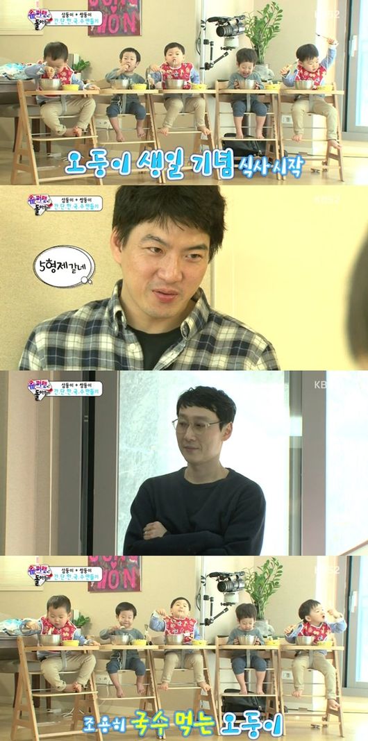 오둥이는 15일 오후 방송된 KBS 2TV ‘슈퍼맨이 돌아왔다’에서 생일을 맞아 국수 파티를 열어 눈길을 끌었다.