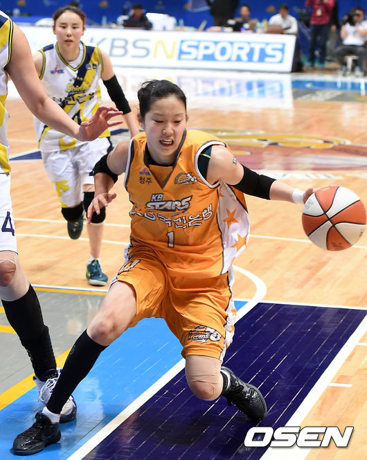 4쿼터 KB스타 홍아란이 드리블 시도하고 있다.