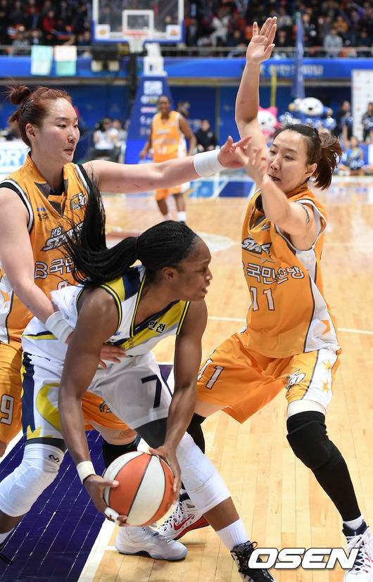 15일 오후 인천 도원체육관에서 2014-2015 KB 국민은행 여자프로농구 플레이오프 1차전 신한은행 에스버드와 KB스타즈의 경기가 열렸다.