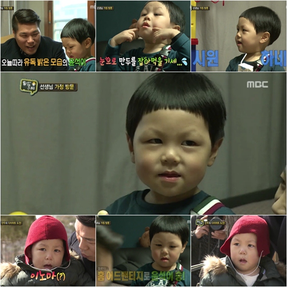그러던 윤석이 엄마, 아빠 앞에서는 귀여운 애교쟁이로 변신했다. 윤석은 좋아하는 음악에 맞춰 덩실 덩실 춤을 추는가 하면, '윤석이 호랑이 어흥'이라고 호랑이 흉내를 내 서장훈을 즐겁게 해주기도 했다.