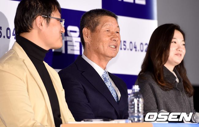 김성근 프로야구 한화 이글스 감독과 조정래-김보경 감독이 16일 오후 서울 행당동 CGV왕십리에서 진행된 영화 '파울볼' (감독 조정래 김보경) 언론시사회에 참석해 취재진의 질문에 답하며 미소짓고 있다.