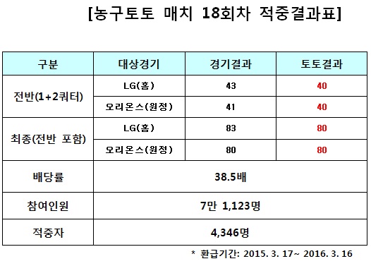 국민체육진흥공단(www.kspo.or.kr)이 발행하는 체육진흥투표권 수탁사업자인 스포츠토토(www.sportstoto.co.kr)는 지난 16일 창원실내체육관에서 열린 국내프로농구(KBL) 6강 플레이오프 5차전 창원LG-오리온스전을 대상으로 한 농구토토 매치 18회차에서 4,346명의 적중자가 나왔다고 밝혔다.