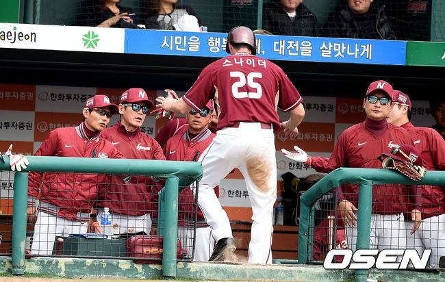 3회초 1사 1,2루에서 넥센 박헌도의 동점 적시 3루타에 1루주자 스나이더가 한화 지성준의 태그에 앞서 홈에서 슬라이딩하며 세이프되고 더그아웃에서 염경엽 감독과 하이파이브를 하고 있다.