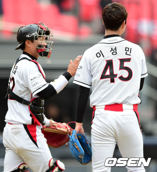 17일 오후 수원kt위즈파크에서 열린 '2015 타이어뱅크 KBO 리그 시범경기' kt 위즈와 LG 트윈스의 경기 종료 후 안중열과 이성민이 하이파이브를 하고 있다.