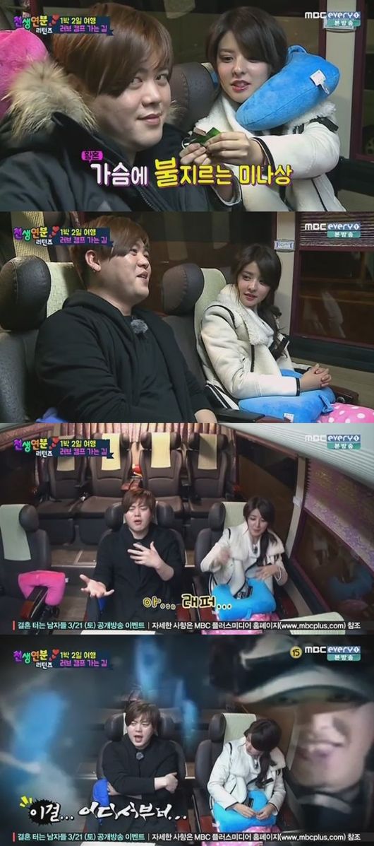 후지이 미나는 17일 오후 방송된 MBC에브리원 '천생연분 리턴즈'에서 문희준과 함께 러브 캠프를 가는 중 "노래하는 사람이에요?"라고 물었다.