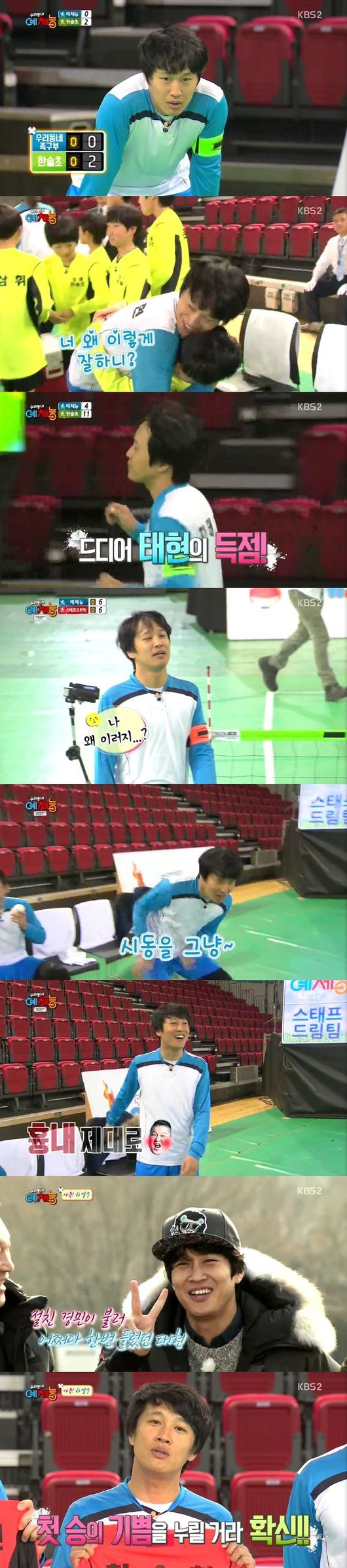 “1승 할 때까지 하겠다”던 차태현의 약속은 적절하게 지켜졌다. 이날 ‘예체능’ 족구팀은 고등학교, 중학교, 초등학교 족구팀과의 대결에서 줄줄이 지고 난 후 KBS 창사 이래 족구에 져본 적이 없는(?) 스태프 드림팀을 이겼고, 끝내 원하고 원하던 1승을 얻었다.