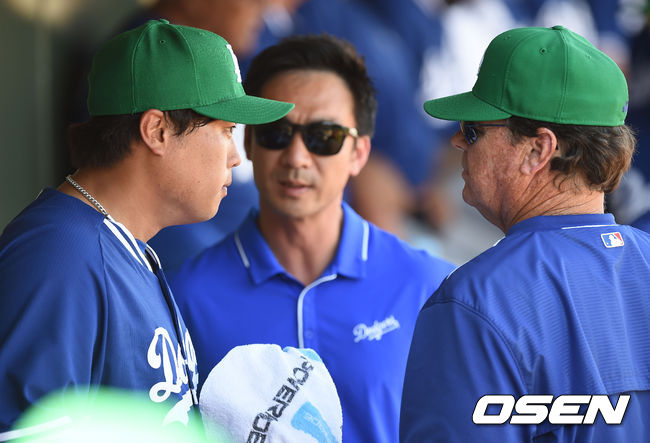 류현진이 허니컷 코치와 이야기를 나누고 있다. / youngrae@osen.co.kr