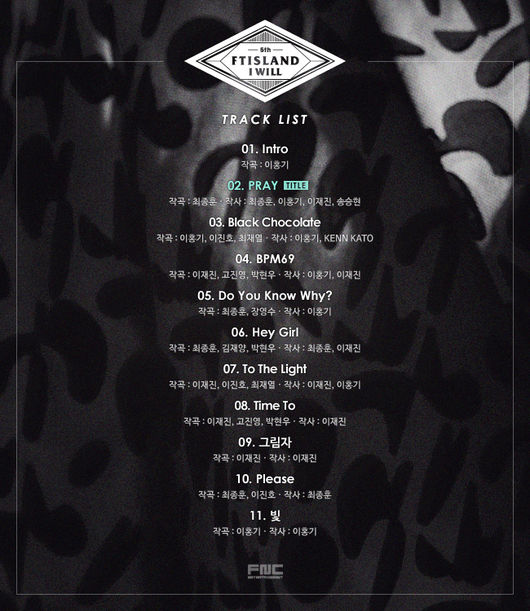 FT아일랜드는 18일 공식 홈페이지를 통해 타이틀곡 ‘프레이(Pray)’와 선공개곡 ‘투 더 라이트(To The Light)’를 포함, 다섯 번째 정규 앨범 ‘아이 윌(I will)’에 수록될 11곡의 트랙리스트를 공개했다.