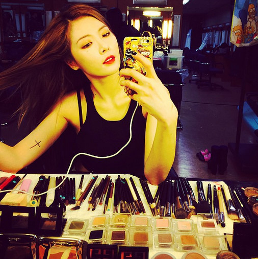 공개된 사진 속 현아는 긴 생머리를 쓸어 넘기며 거울에 비친 자신을 휴대폰으로 찍고 있는 모습이다. 특히 민소매 상의로 드러난 현아의 팔뚝에 새겨진 십자가 모양의 타투가 보는 이들의 시선을 사로잡고 있다.