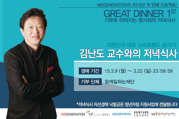 온라인 기부 서비스 위제너레이션(wegen.kr)은 대한민국 대표 소비트렌드 분석가인 '김난도 교수와의 저녁식사' 자선경매를 지난 9일부터 2주간 진행 중이다. 온라인 경매를 통해 최고 입찰자 1인에게 '김난도 교수와의 저녁식사' 기회를 제공할 예정이다.