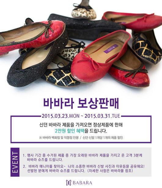 컨템포러리 슈즈 브랜드 ㈜바바라앤코 바바라(BABARA)에서 2015년 봄을 맞이해 보상판매를 실시한다.