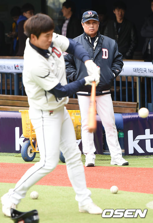 경기시작전 김태형 두산 감독이 허경민의 타격을 지켜보고 있다.