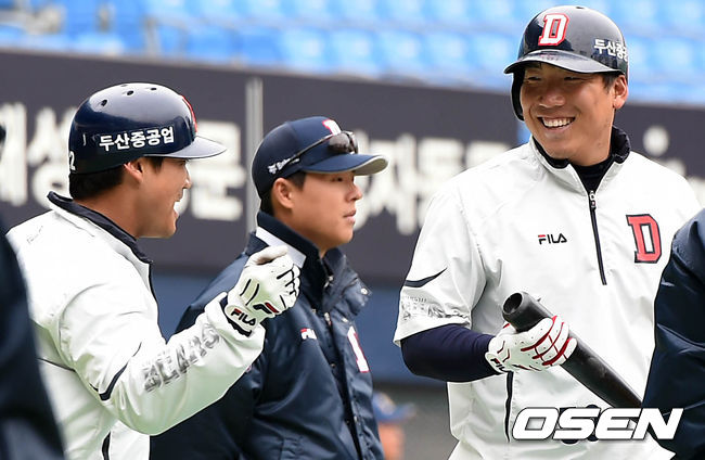 경기시작전 두산 김현수와 홍성흔이 이야기를 나누고 있다.