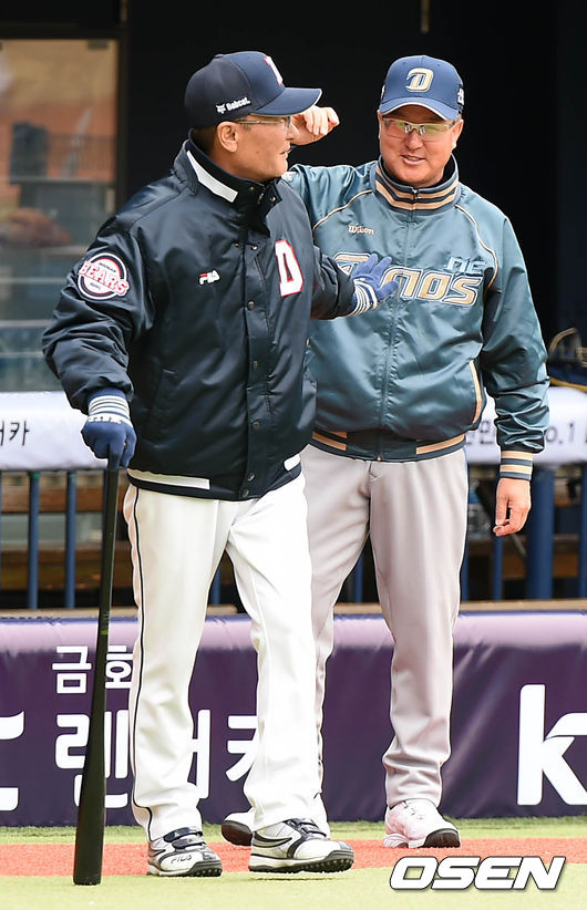 경기시작전 NC 김경문 감독과 두산 유치훤코치가 이야기를 나누고 있다.