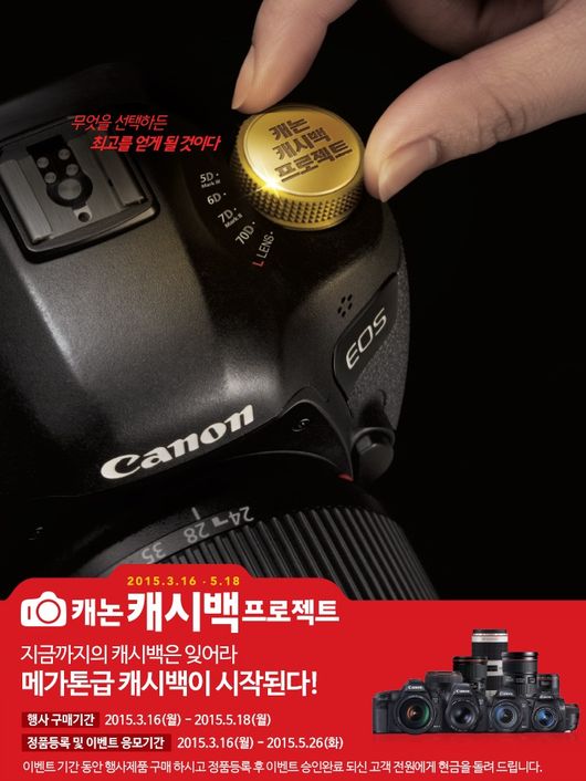 디지털 광학 이미징 기술 선도기업 캐논코리아컨슈머이미징㈜(대표이사 강동환, www.canon-ci.co.kr)이 자사 DSLR 카메라 및 EF L렌즈 구매자를 대상으로 '캐논 캐시백 프로젝트'를 진행한다.