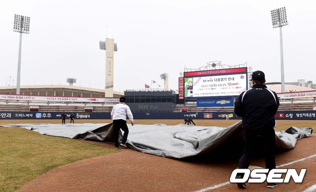 비로 인해 경기가 취소된 수원케이티위즈파크에서 관계자들이 그라운드를 방수포로 덮고 있다./dreamer@osen.co.kr