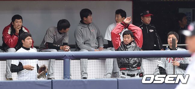LG 이병규-이진영을 비롯한 선수들이 비오는 그라운드를 바라보고 있다./dreamer@osen.co.kr
