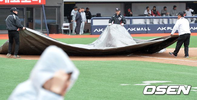비로 인해 경기가 취소된 수원케이티위즈파크에서 관계자들이 그라운드를 방수포로 덮고 있다./dreamer@osen.co.kr