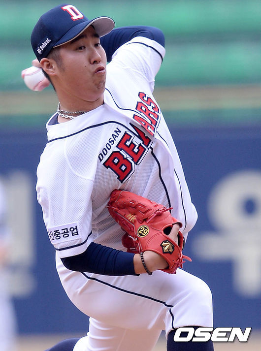 1회초 두산 선발투수 유희관이 힘차게 공을 던지고 있다.