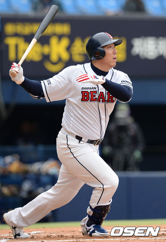 1회말 1사 주자 1,3루 두산 김현수가 1타점 외야플라이를 성공시켜 3루주자 민병헌을 홈으로 불러들이고 있다.